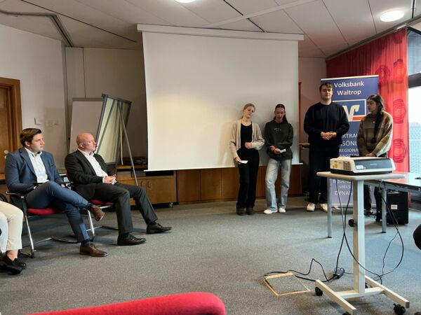 Break Even-Punkt, Stückkosten, Gewinnmarge: Die Schülergenossenschaft des THGs besuchte die Volksbank Waltrop, wo den motivierten Schülerinnen und Schülern zahlreiche Fragen zu ihren Businesskonzepten gestellt wurden. Diese hatten die Jugendlichen in den letzten Monaten ausgearbeitet. Die erfahrenen Bankberater Herr Scholten (Regionalleiter der Volksbank Ostvest) und Herr Bücker (Leiter der Abteilung für mittelständische Unternehmen) sowie der Perspektivberater Herr Mecke und die Auszubildende Frau Aravi gaben den angehenden Jungunternehmerinnen und Jungunternehmern wertvolles Feedback zu ihren Geschäftsideen.